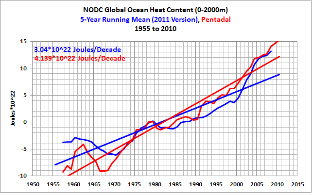 So it is plain in the ARGO era that the oceans are not warming and this contradicts AGW. In my articles I noted that NODC graphs were shown in joules which allowed a steeper slope compared to a temperature trend. Mischievously I suggested an ulterior motive for this. Alarmism.