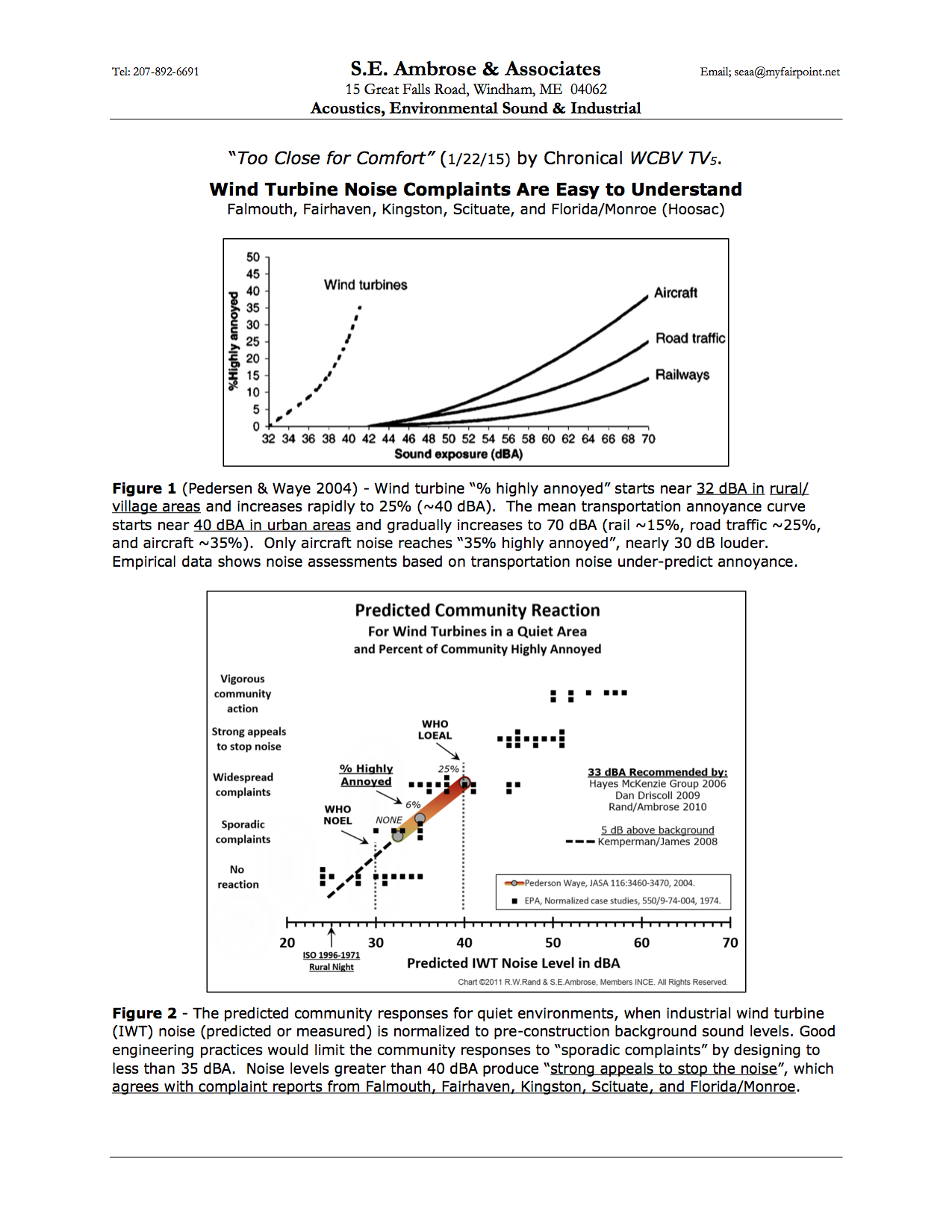 Wind turbine noise is different from other types of noise, as acoustician Stephen Ambrose explains through two charts. The first is from the study done in Sweden in 2004, when Eja Pedersen and Kerstin Waye illustrated their findings with the top graph below. In the second chart, Ambrose and Robert Rand developed a schematic to show the results of numerous studies which independently echo the lived experience of wind turbine neighbors. Too loud, which often means too close, is predictable from the volume of complaints. For more on turbine acoustics, click on Wind Turbine Noise Complaint Predictions Made Easy, or link to the “Too Close for Comfort” segment of Chronicle.