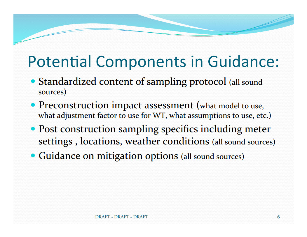 This table shows the relevant slides on potential regulation and guidelines. Click on a slide to view it or access the whole draft at Scope of Possible Noise Regulation and Policy.