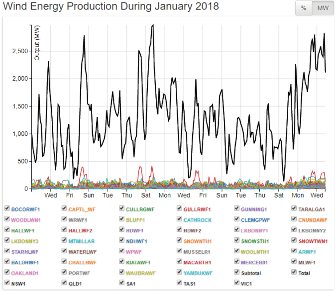 Graphs like the one above – depicting the entire output of every wind turbine connected to Australia’s Eastern Grid (spread across four states, NSW, Victoria, Tasmania and South Australia) – quickly gave the game away.