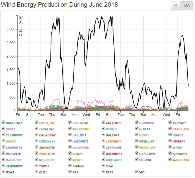 Ignoring pesky phenomena, such as calm weather and sunset, the latest wheeze is that – when wind power output collapses on a total and totally unpredictable basis (see above the output from every wind turbine connected to Australia’s Eastern Grid in June) and/or the sun goes down and solar output plummets with it – giant batteries will, somehow, save the day.
